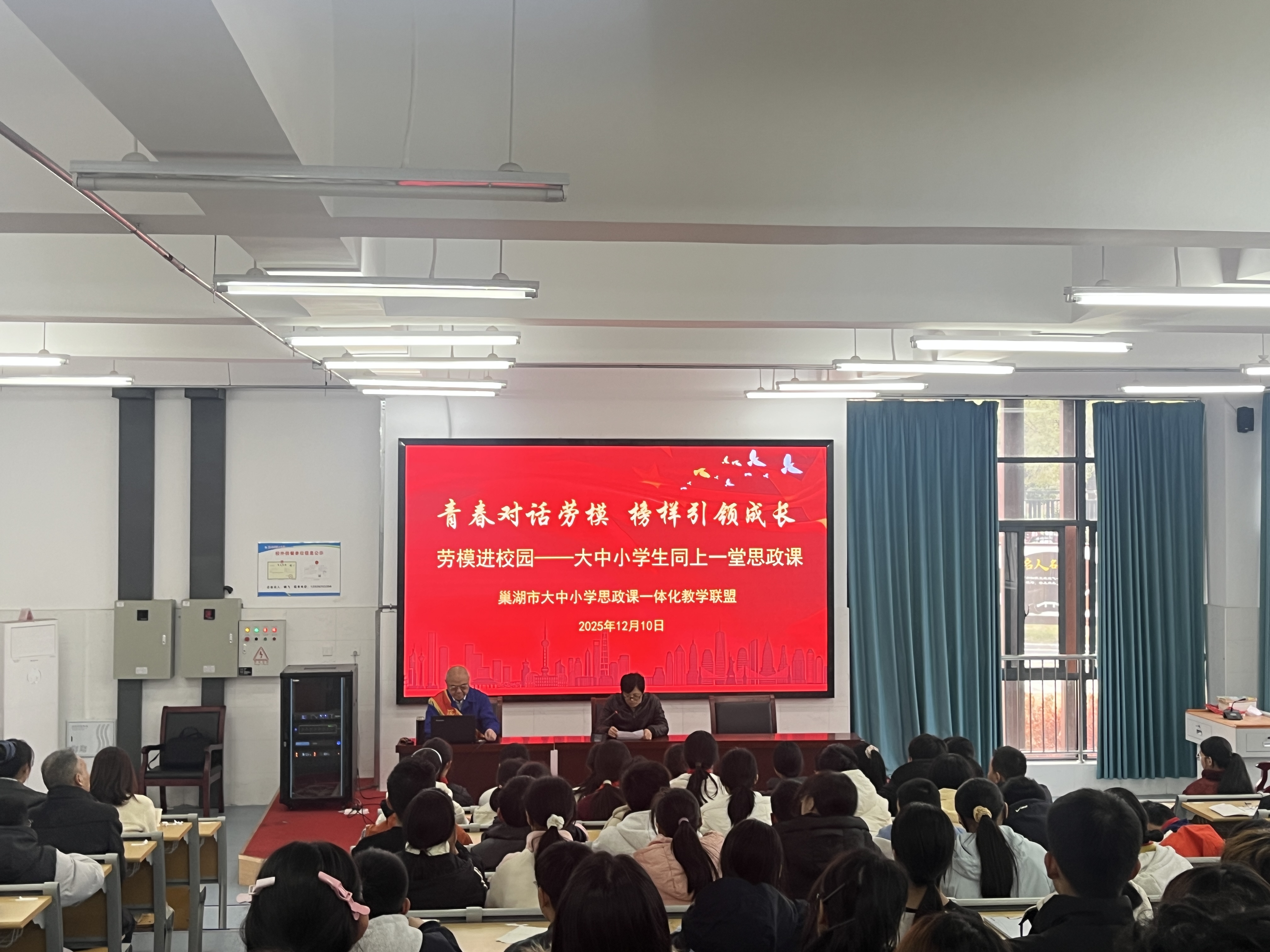2025年12月10日下午,由我校牵头组织的“劳模进校园”宣讲活动在巢湖三中半汤校区举行。作为巢湖市大中小学思政课一体化教学联盟的牵头单位,本次活动以“青春对话劳模,榜样引领成长”为主题,特邀全国劳动模范徐辉进行宣讲。教学联盟各成员单位代表及我校马克思主义学院胡心红院长和部分思政教师、鼓山校区学生代表以及巢湖三中学生代表等共同参与,现场气氛热烈,互动频繁。